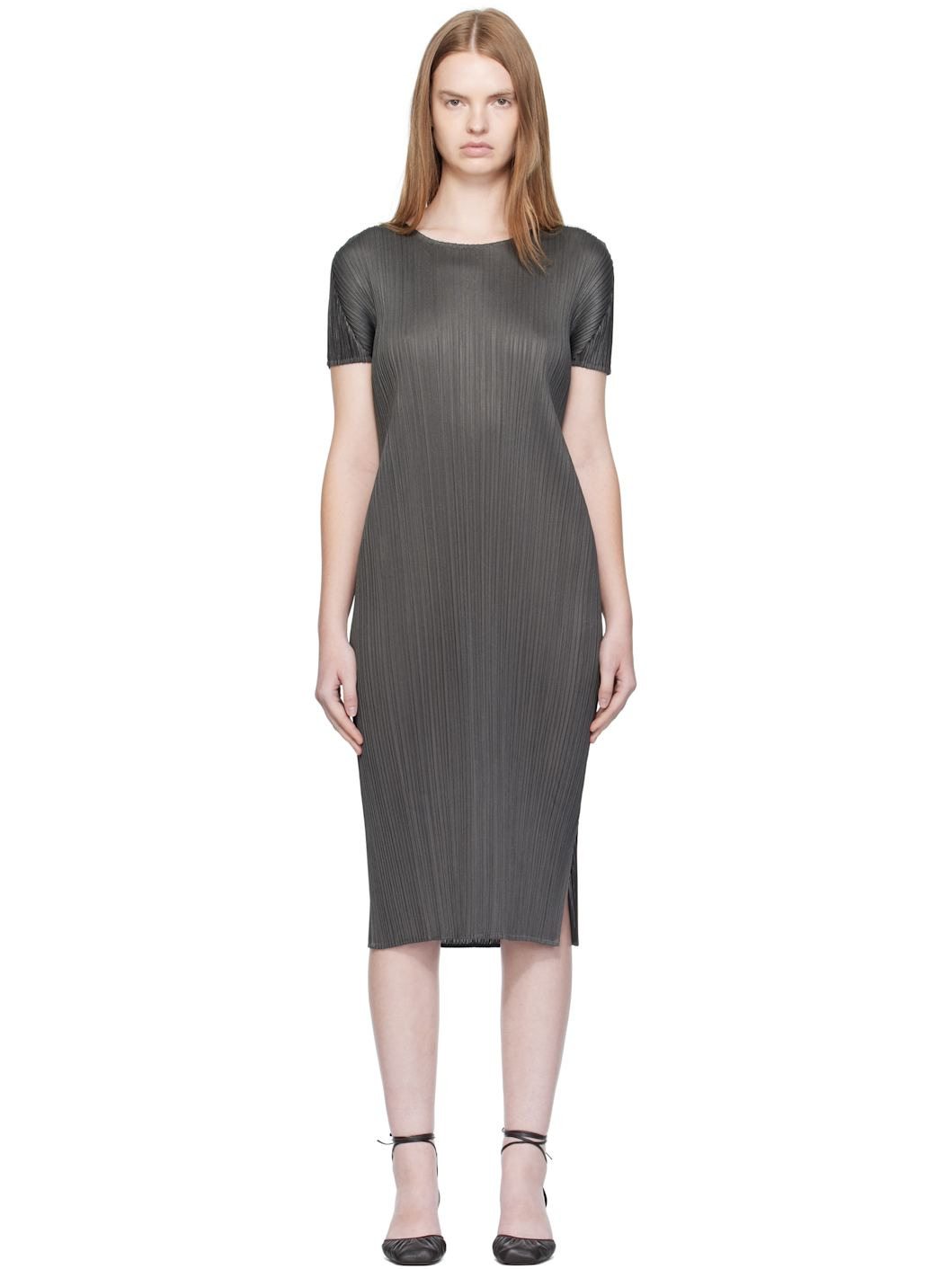 Garment-pleated tricot midi dress. · Round neck · Slit at side seam · Cap sleeves Supplier color: Charcoal gray 100% polyester. Made in Japan 252941F054006