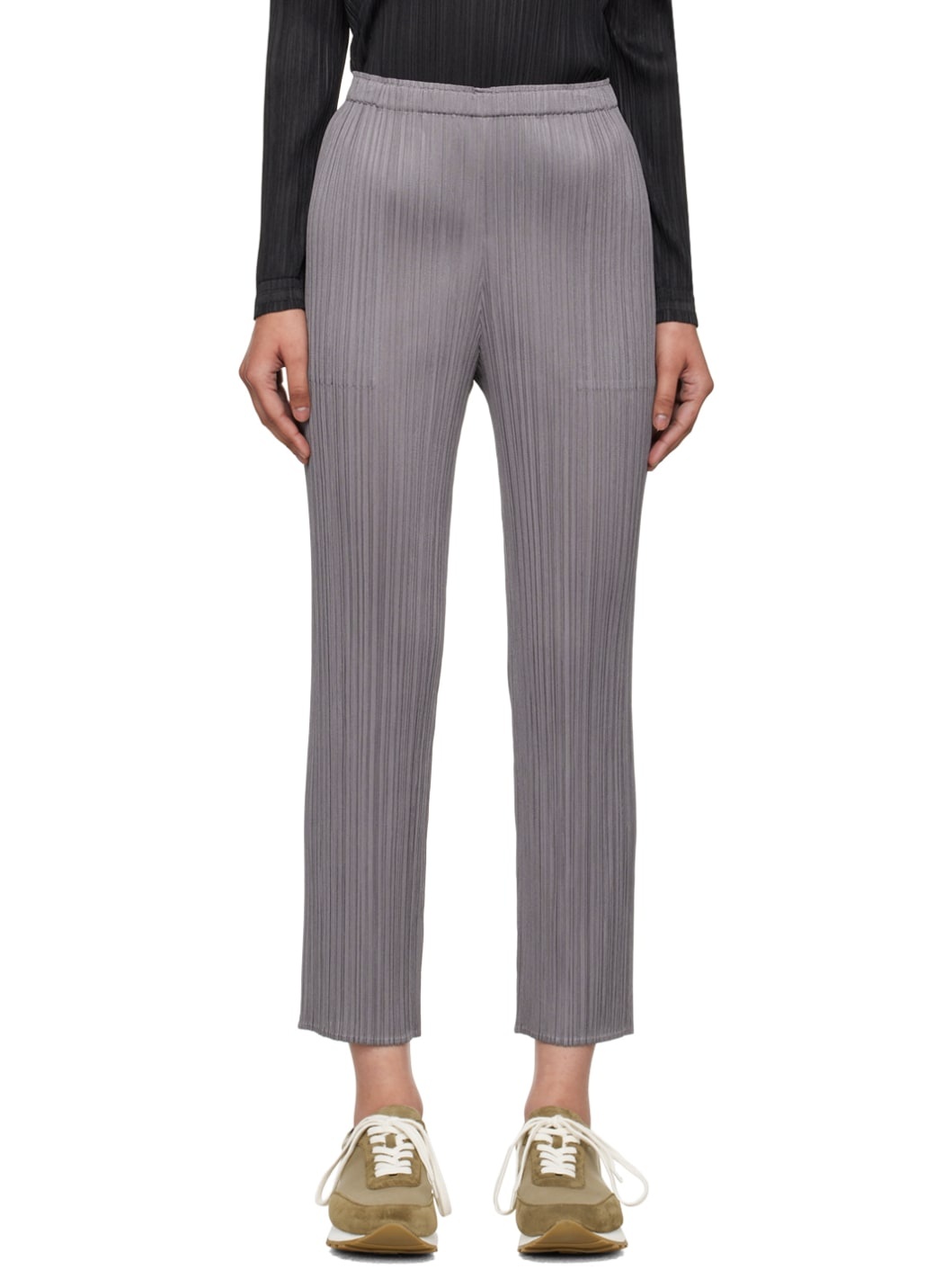 Garment-pleated polyester tricot trousers. · Elasticized waistband · Two-pocket styling Supplier color: Gray 100% polyester. Made in Japan 242941F087016