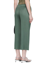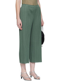 Garment-pleated tricot trousers. · Wide-leg · Elasticized waistband · Two-pocket styling · Cropped legs Supplier color: Moss green 100% polyester. Made in Japan 252941F087016