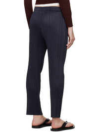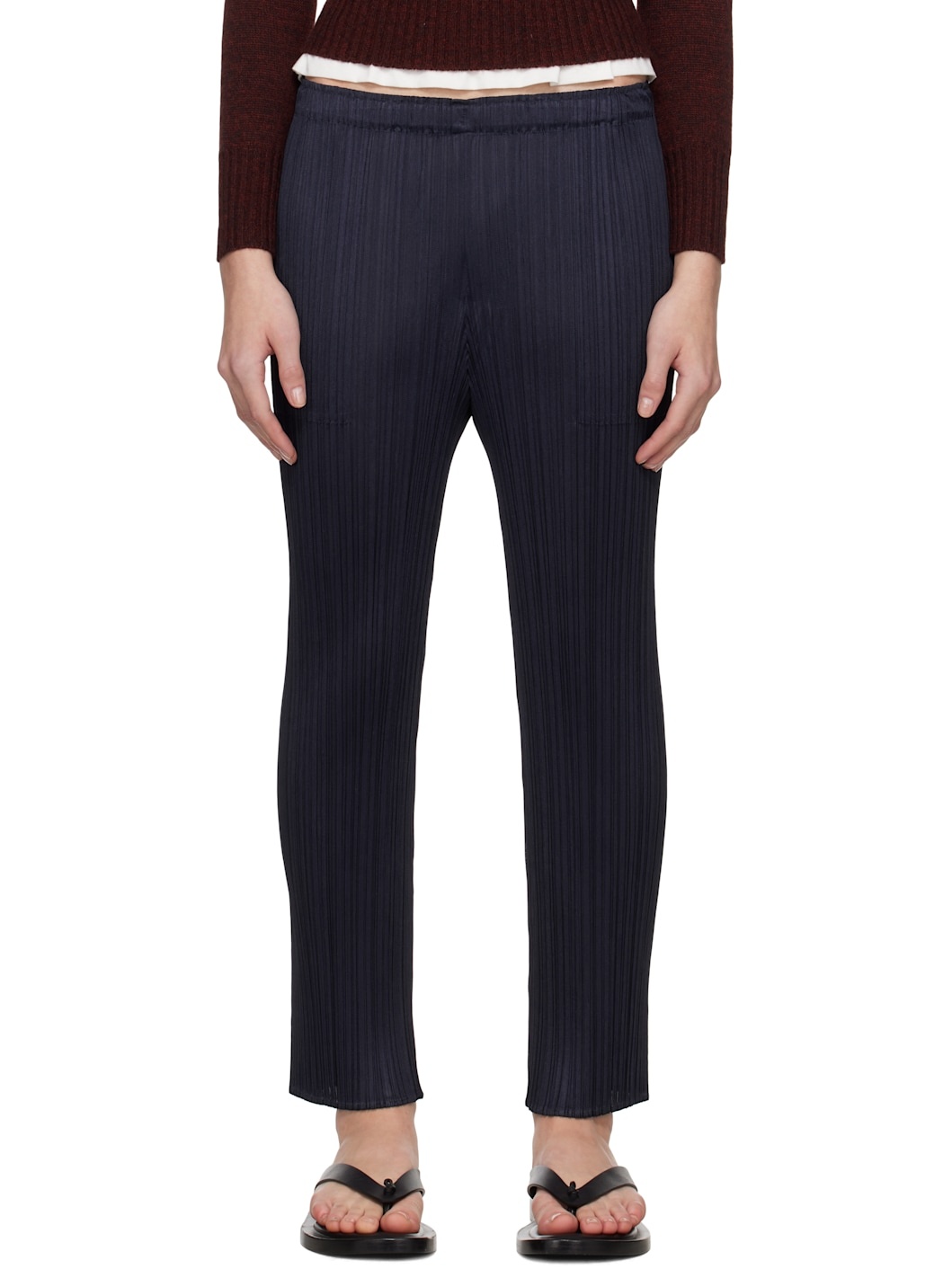 Garment-pleated polyester tricot trousers. · Elasticized waistband · Two-pocket styling Supplier color: Navy 100% polyester. Made in Japan 252941F087032