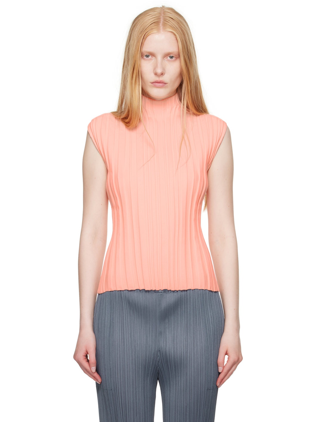 Rib-knit polyester top. · Mock neck · Cap sleeves Supplier color: Light pink 100% polyester. Made in Japan 252941F099012