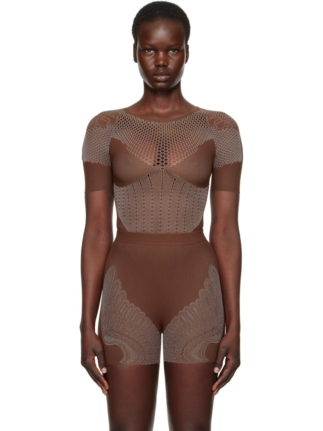 Semi-sheer stretch nylon-blend jersey and mesh bodysuit. · Round neck · Press-stud fastening at bottom · Logo embroidered at shoulders and back Supplier color: Old Money Brown 45% polyamide, 43% polyester, 12% elastane. Made in Italy 251770F358010