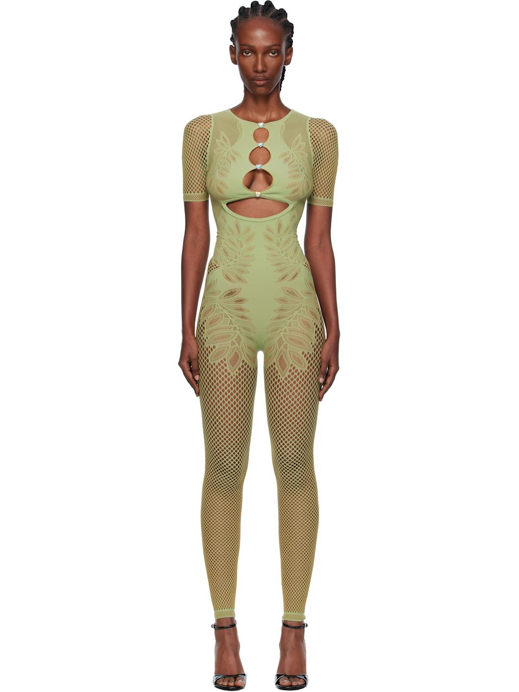 Stretch fishnet jumpsuit. · Semi-sheer · Pointelle-knit floral pattern throughout · Round neck · Keyhole cutouts with crystal at chest · Button closure with crystal at back collar · Jacquard logo at back Supplier color: Green 45% polyamide, 43% polyester, 12% elastane. Made in Italy 252770F070013