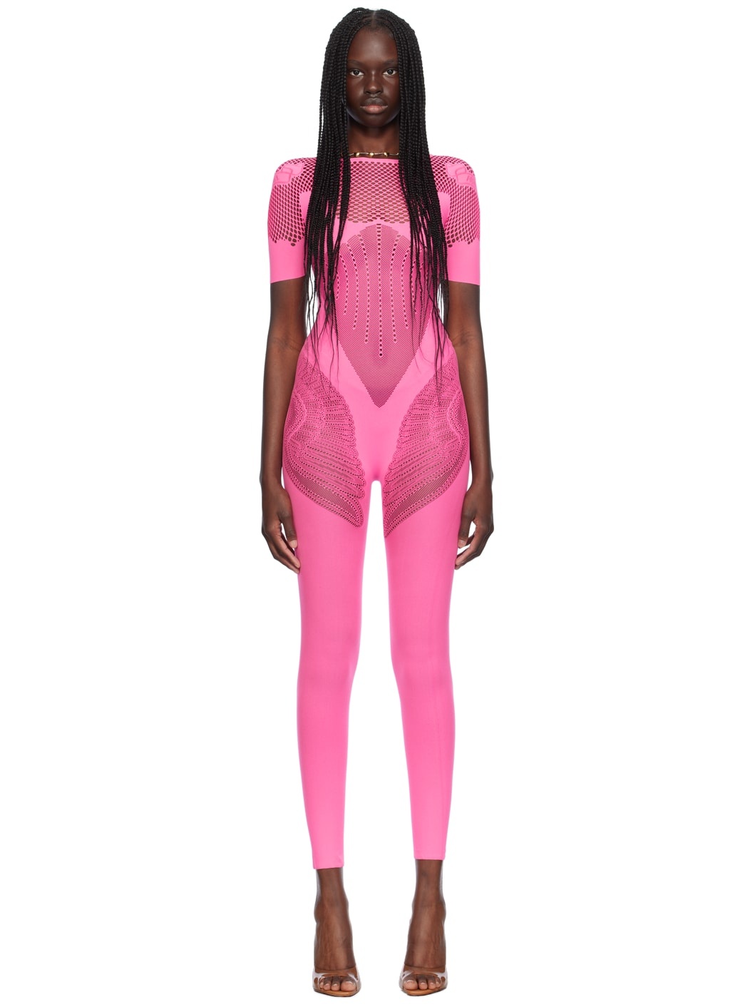 Semi-sheer stretch nylon-blend jersey and fishnet jumpsuit. Pointelle knit detailing throughout. · Round neck · Crystal-cut graphic button fastening at back collar · Keyhole at back collar · Jacquard logo at back Supplier color: Pink 45% polyamide, 43% polyester, 12% elastane. Made in Italy 242770F070037