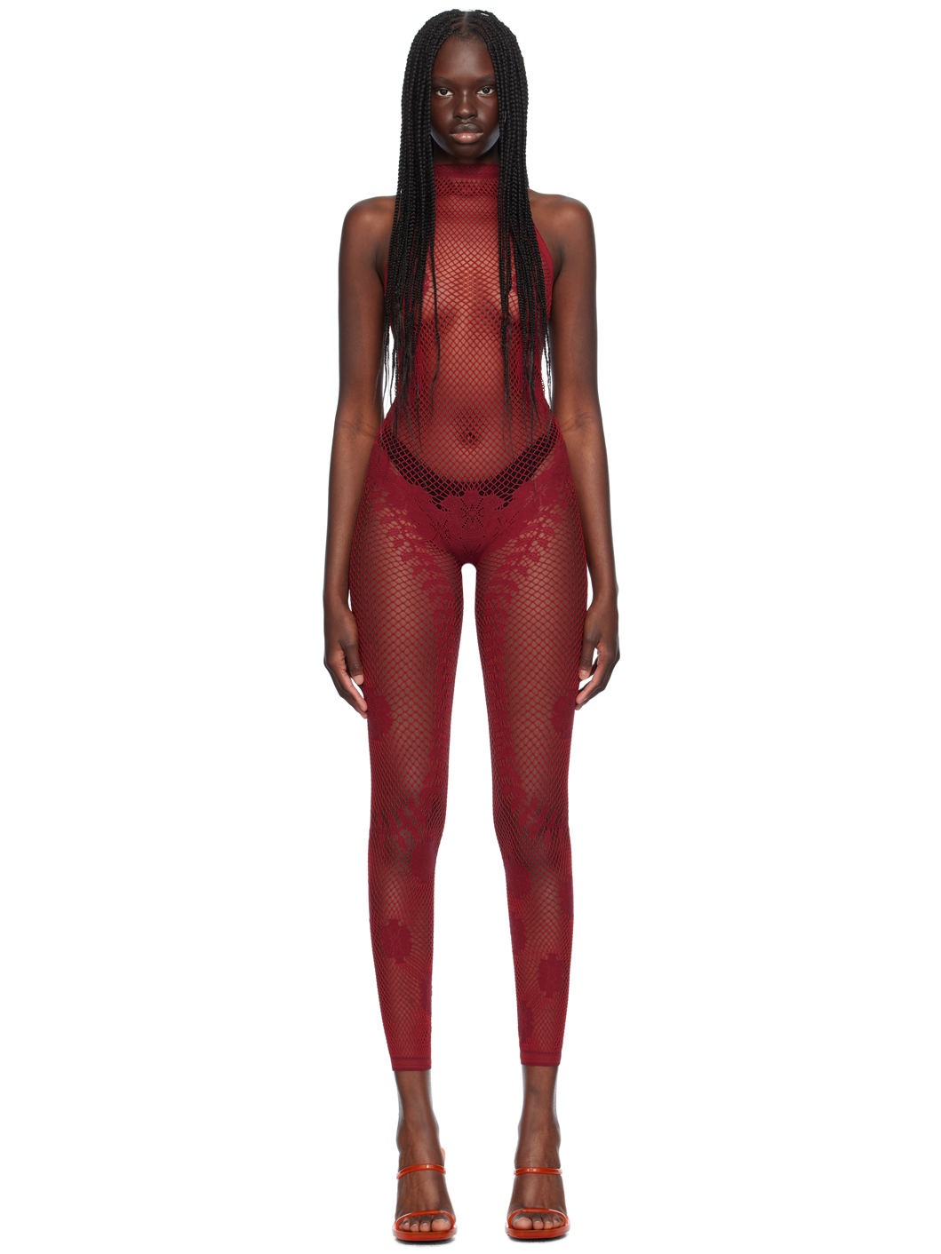 Sheer stretch nylon-blend fishnet jumpsuit. Jacquard floral pattern throughout. · Crewneck · Crystal-cut graphic button closure at back collar · Keyholes at back collar · Jacquard logo at back Supplier color: Red 45% polyamide, 43% polyester, 12% elastane. Made in Italy 242770F070019