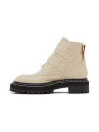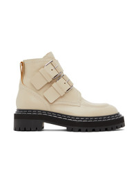 Ankle-high buffed calfskin boots in beige. · Pin-buckle fastening at vamp · Pull-loop at heel tab · Topstitching in white at welt · Foam rubber midsole · Treaded rubber outsole · Heel: H1.5 in Supplier color: Natural Upper: calfskin. Sole: rubber. Made in Italy 222288F113028