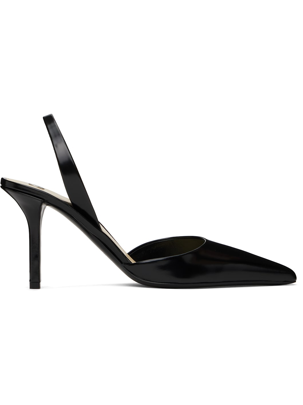 Spazzolato calfskin heels in black. · Pointed toe · Partially elasticized slingback strap · Logo hardware at grained calfskin footbed · Stiletto heel with rubber injection · Polished calfskin sole · Heel: H3.25" Supplier color: Black
