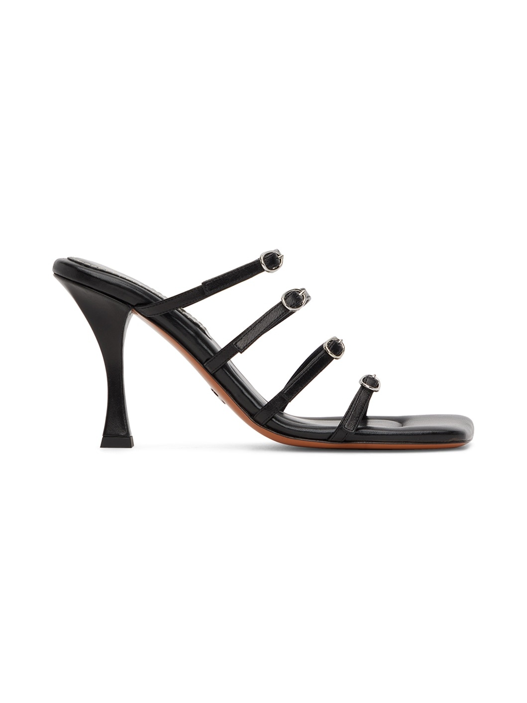 Buffed leather heeled sandals in black. · Open square toe · Adjustable pin-buckle straps at vamp · Logo embossed at padded footbed · Rubber injection at covered stiletto heel · Leather sole · Heel: H3.75 in Supplier color: Black Leather. Made in Italy 231288F125004