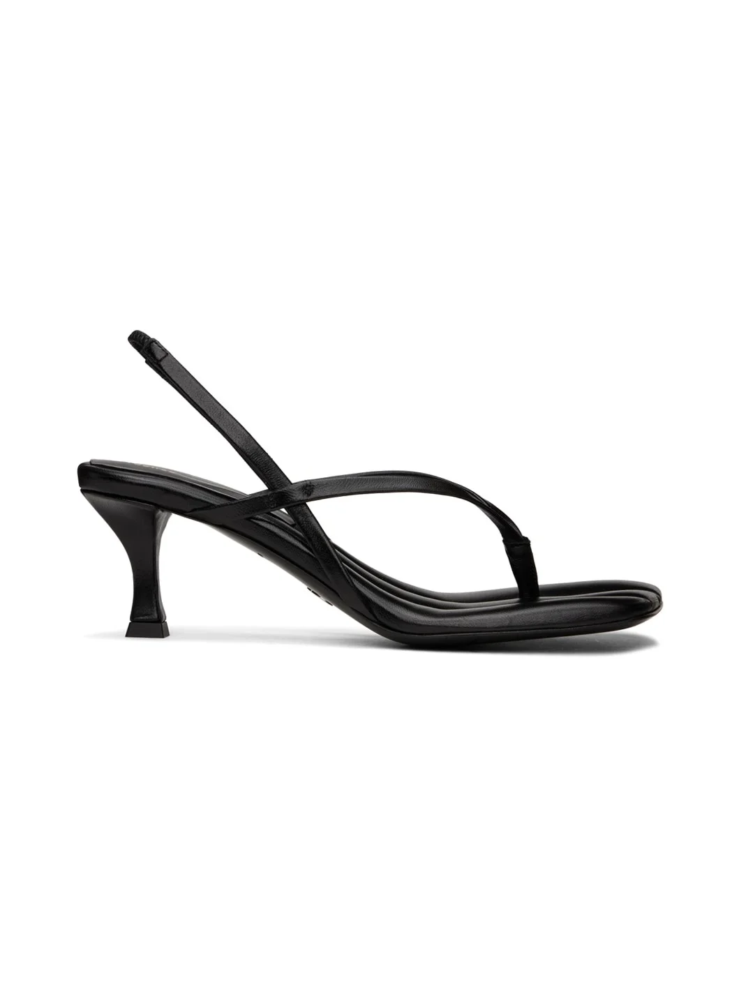 Grained nappa leather heeled sandals in black. · Open square toe · Thong-style strap · Partially elasticized ankle strap · Logo stamp at quilted footbed · Rubber injection at covered stiletto heel · Logo hardware at leather outsole · Heel: H2.5 in Supplier color: Black