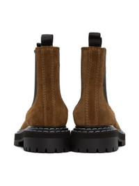 Ankle-high suede Chelsea boots in brown. · Webbing pull-loops at collar · Elasticized gusset at sides · Topstitching in white at welt · Foam rubber midsole · Treaded rubber outsole · Heel: H2 in Supplier color: Almond Upper: calfskin. Sole: rubber.