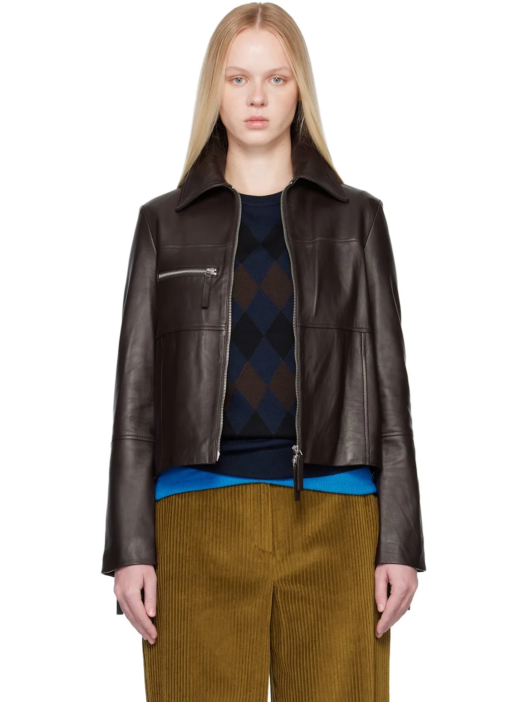 Buffed nappa lambskin jacket. · Spread collar · Two-way zip closure · Zip pocket at chest · Seam pockets at chest · Zip vent at cuffs · Full twill lining Part of the Proenza Schouler White Label collection. Supplier color: Chocolate Body: 100% nappa lambskin. Lining: 100% cupro. Made in India 252288F064000