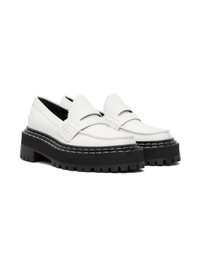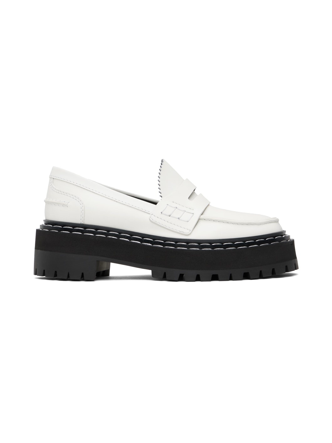 Buffed calfskin loafers in off-white. · Round moc toe · Strap with cutout at vamp · Serrated edge at tongue · Pinched seam at heel counter · Full buffed calfskin lining in black · Topstitching at tiered welt · Foam rubber platform midsole · Lugged rubber outsole · Platform: H1.75 in Supplier color: Natural Upper: calfskin. Sole: rubber. Made in Italy 231288F121006
