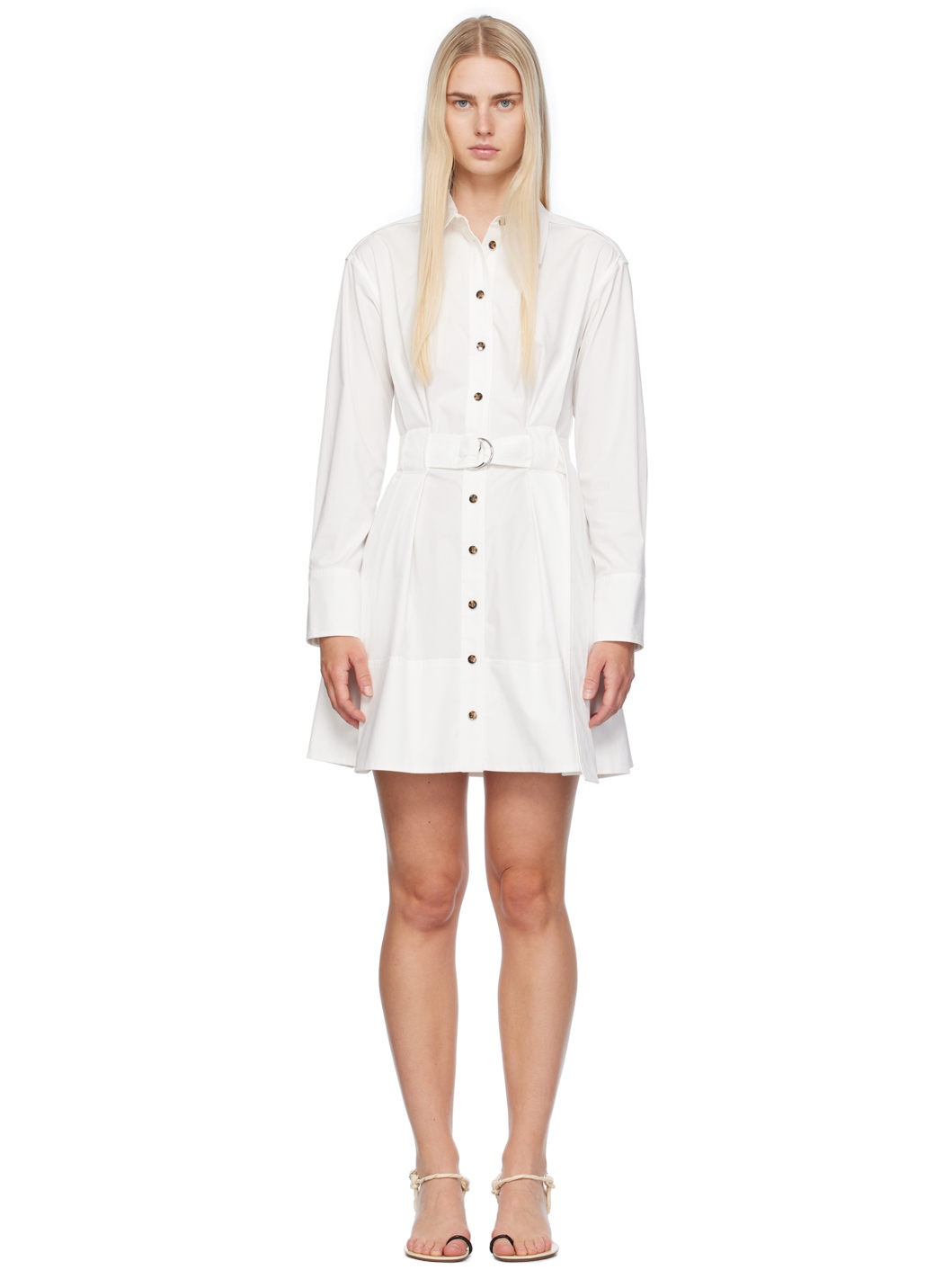 Stretch cotton poplin dress. · Spread collar · Button closure · Belt loops and detachable cinch belt · Box pleats at front and back · Seam pockets · Two-button barrel cuffs · Inverted box pleat at back · Unlined Supplier color: White Body: 96% cotton, 4% elastane. Lining: 100% cotton. Made in Poland 242288F052001