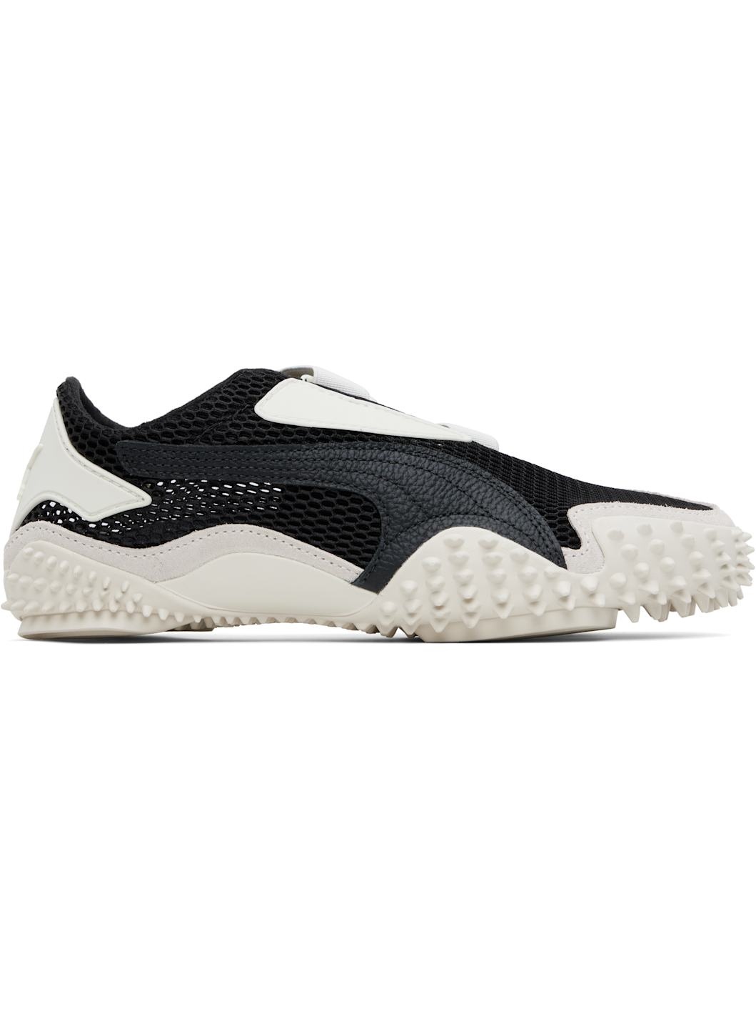 Low-top mesh sneakers in black and gray. · Rubberized trim throughout · Logo patch at offset velcro strap · Logo patch and concealed elasticized gusset at tongue · Grained faux-leather Formstrip at outer side · Logo embossed at heel counter · Cushioned OrthoLite® footbed · Faux-suede trim at welt · Spikes at rubber midsole · Treaded rubber sole Supplier color: Vapor gray/Puma black Upper: textile. Sole: rubber. Made in Cambodia 252010F128001