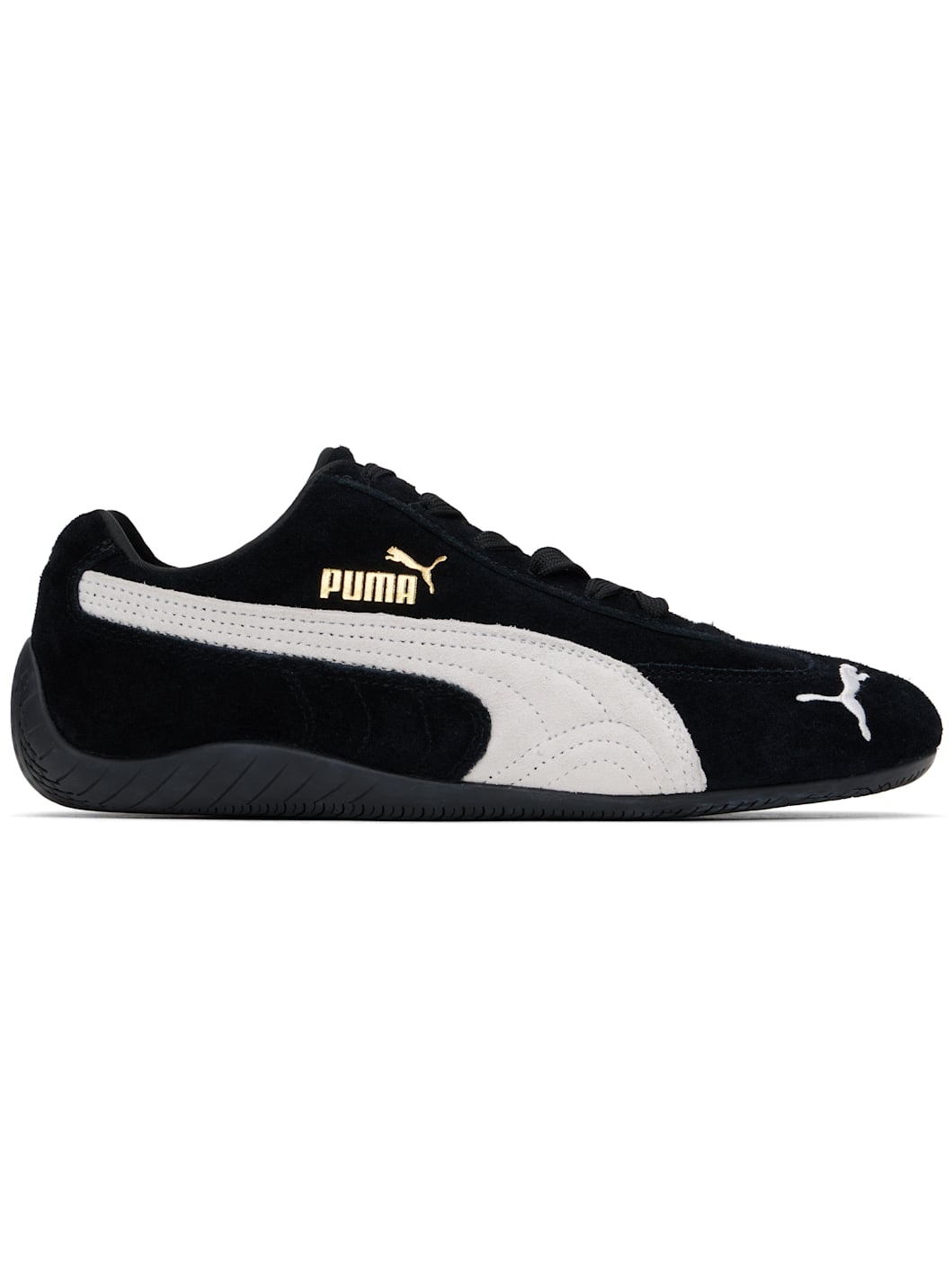 Low-top LWG-certified suede sneakers in black and white. · Logo embroidered at toe · Lace-up closure · Logo stamp at padded tongue · Padded collar · Logo stamp at outer side and heel tab · Formstrip at sides · Mesh lining · Treaded rubber sole Supplier color: PUMA black/PUMA white Upper: leather. Sole: rubber. Made in China 251010M237029