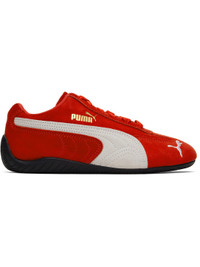 Low-top LWG-certified suede sneakers in red and white. · Logo embroidered at toe · Lace-up closure · Logo stamp at padded tongue · Padded collar · Logo stamp at outer side and heel tab · Formstrip at sides · Cushioned OrthoLite® footbed · Mesh lining · Treaded rubber sole Supplier color: All time red/White Upper: leather. Sole: rubber. Made in Colombia 251010F128010