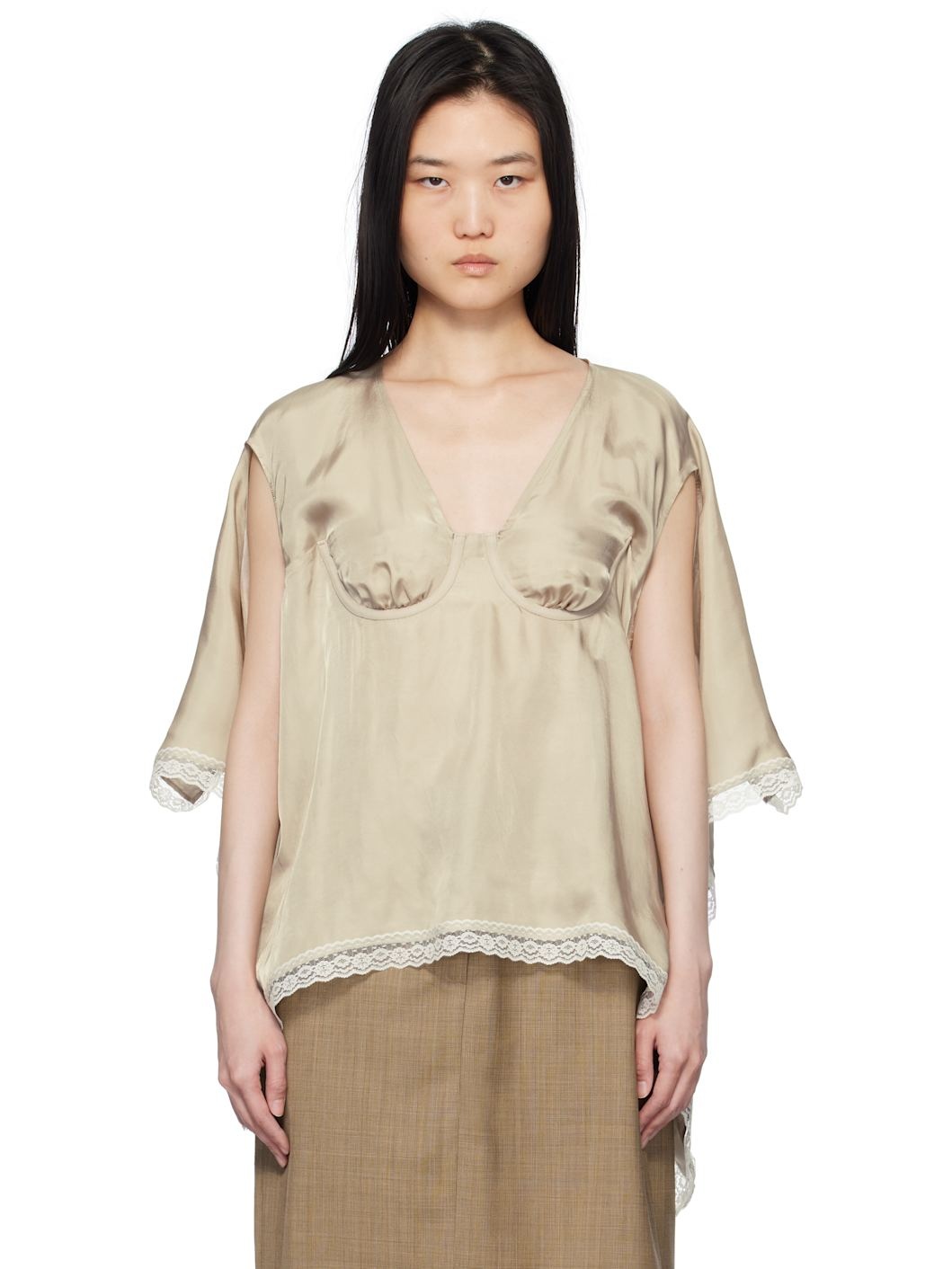 Rayon satin blouse. Integrated bra with adjustable hook-eye fastening at interior. Lace trim throughout. · Modified V-neck · Underwire and gathering at cups · Curved hem · Open back Supplier color: Beige Body 1: 100% rayon. Body 2: 100% cotton. Made in South Korea 251252F107004