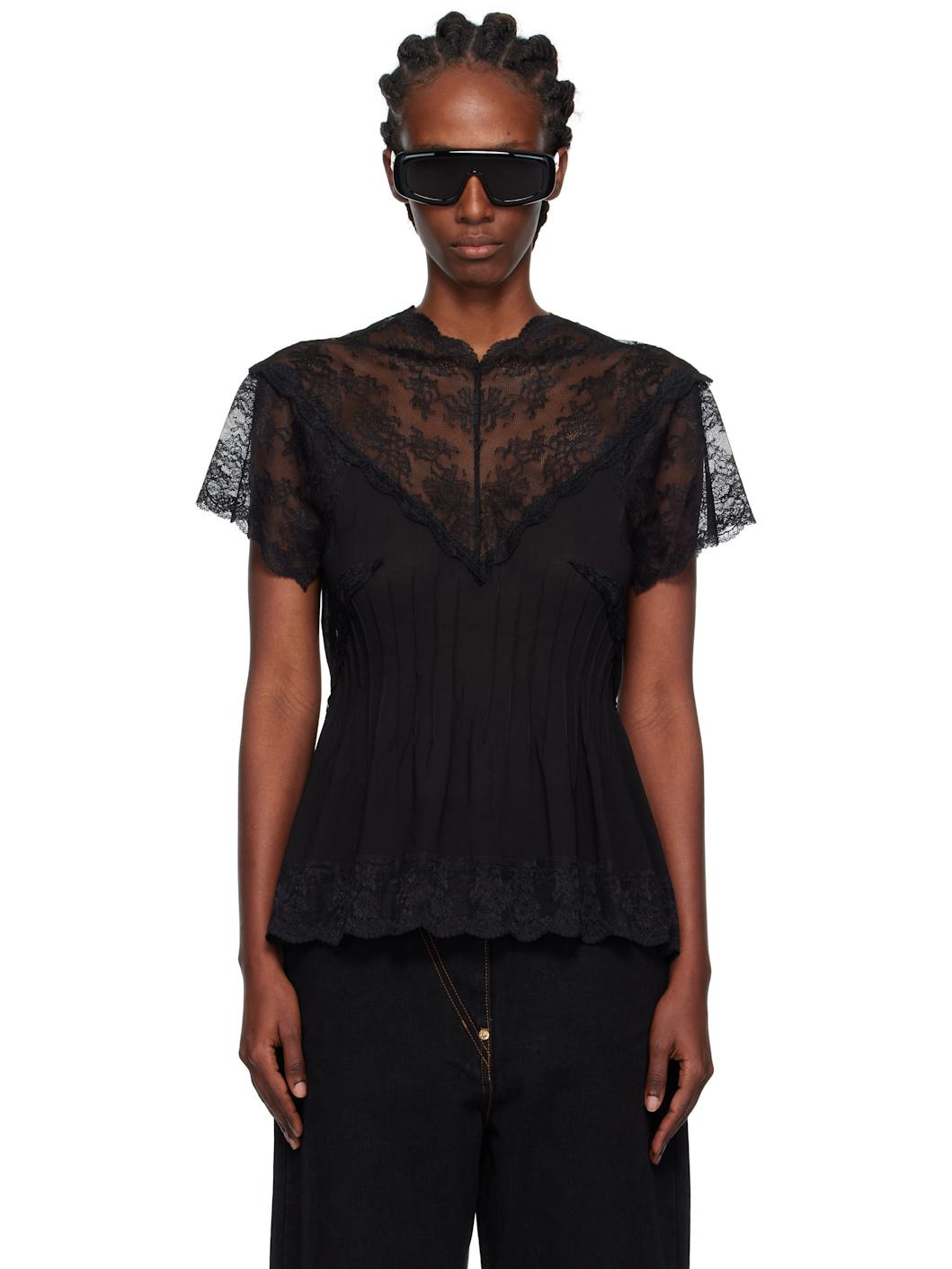 Semi-sheer modal-blend lace and chiffon top. · Darts throughout · Scalloped edge at V-neck, hem, and cuffs · Button and zip closure at back Supplier color: Bk 52% polyester, 30% modal, 18% cotton. Made in South Korea 252252F107004