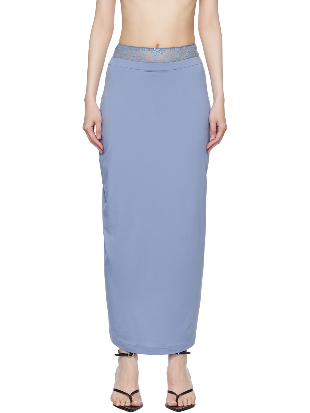 Stretch polyester interlock jersey maxi skirt. Stretch nylon lace briefs-style underlay with bow at elasticized waistband. · Twisted side seams · Draping at curved back hem Supplier color: Blue Body 1: 92% polyester, 8% polyurethane. Body 2: 95% nylon, 5% spandex. Made in South Korea 251252F092004