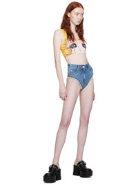 Non-stretch denim shorts. · Belt loops · Five-pocket styling · Zip-fly · Raw edge at hem · Logo patch at back waistband · Contrast stitching in tan Supplier color: Blue 100% cotton. Made in South Korea 232252F088021