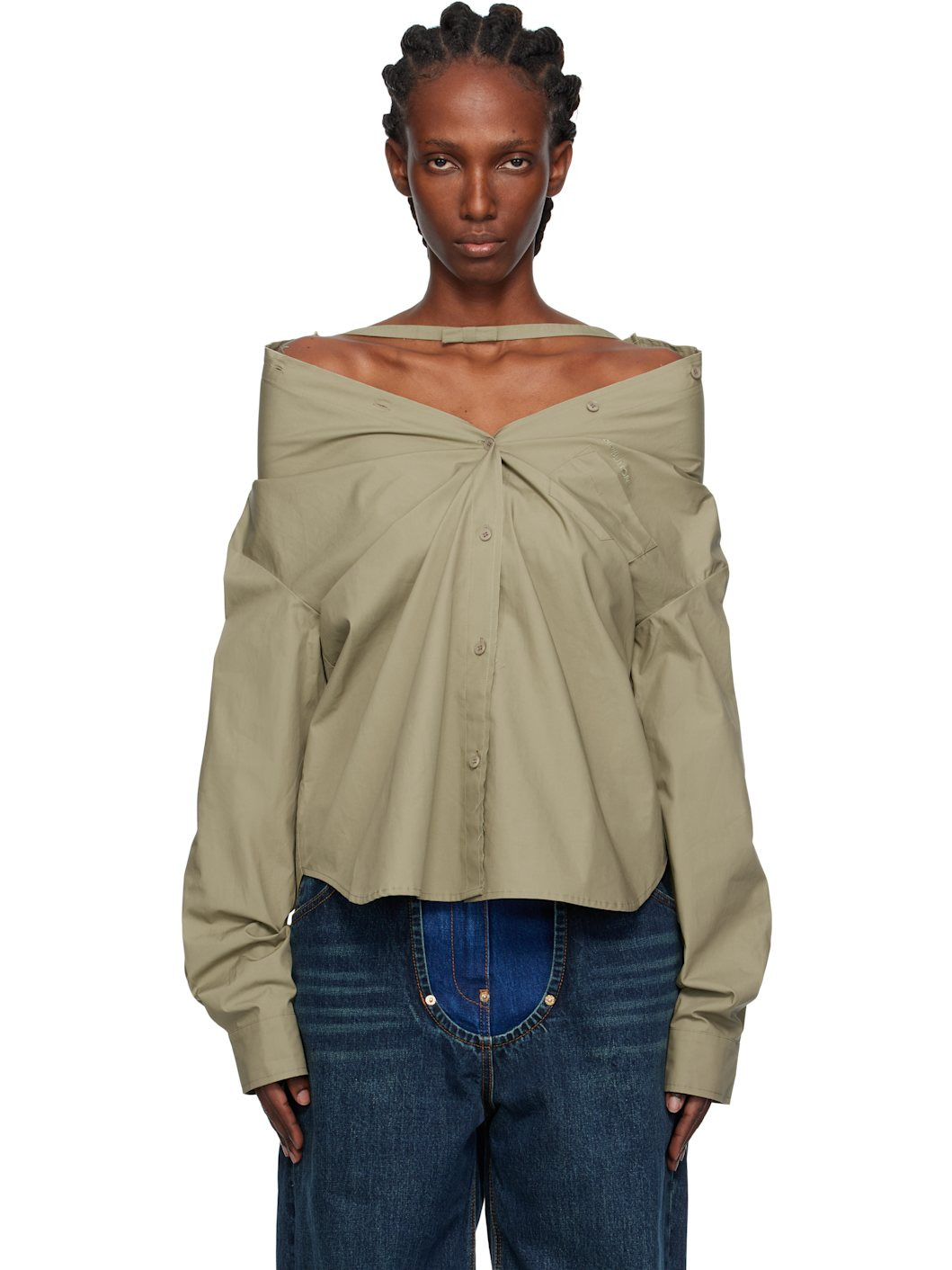 Cotton poplin shirt. · Raw edges throughout · Bow at boatneck · Button closure at front and back · Embroidered logo and patch pocket at chest · Shirttail hem · Dropped shoulders · Buttoned barrel cuffs Supplier color: Kh 100% cotton. Made in South Korea 252252F109016
