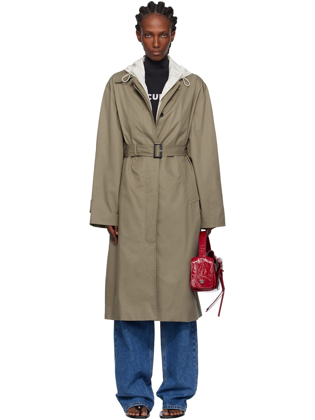 Cotton gabardine trench coat. · Bungee-style drawstring at detachable ripstop hood · Spread collar · Button closure · Belt loops and detachable pin-buckle belt at waist · Welt pockets · Button tab at cuffs · Central vent at back hem · Full satin lining Supplier color: Kh Body: 100% cotton. Trim: 100% polyester. Lining: 100% polyester. Made in South Korea 252252F067000