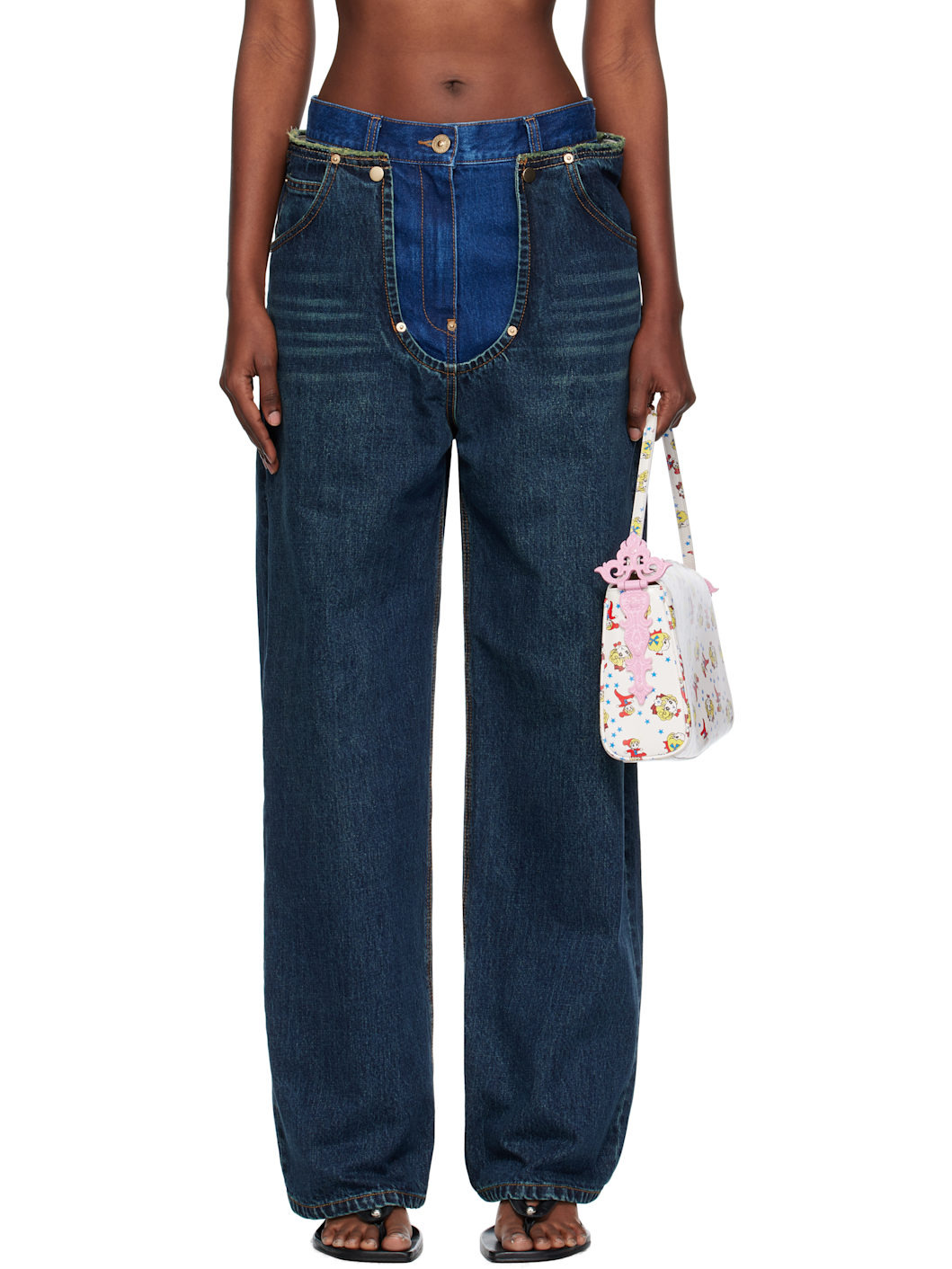 Non-stretch denim jeans. · Fading and whiskering throughout · Belt loops and frayed edge at layered waistband · Five-pocket styling · Zip fly · Graphic patch at back waistband · Contrast stitching in tan Supplier color: D bl Body 1: 100% cotton. Body 2: 100% cotton. Made in South Korea 252252F069025