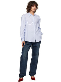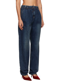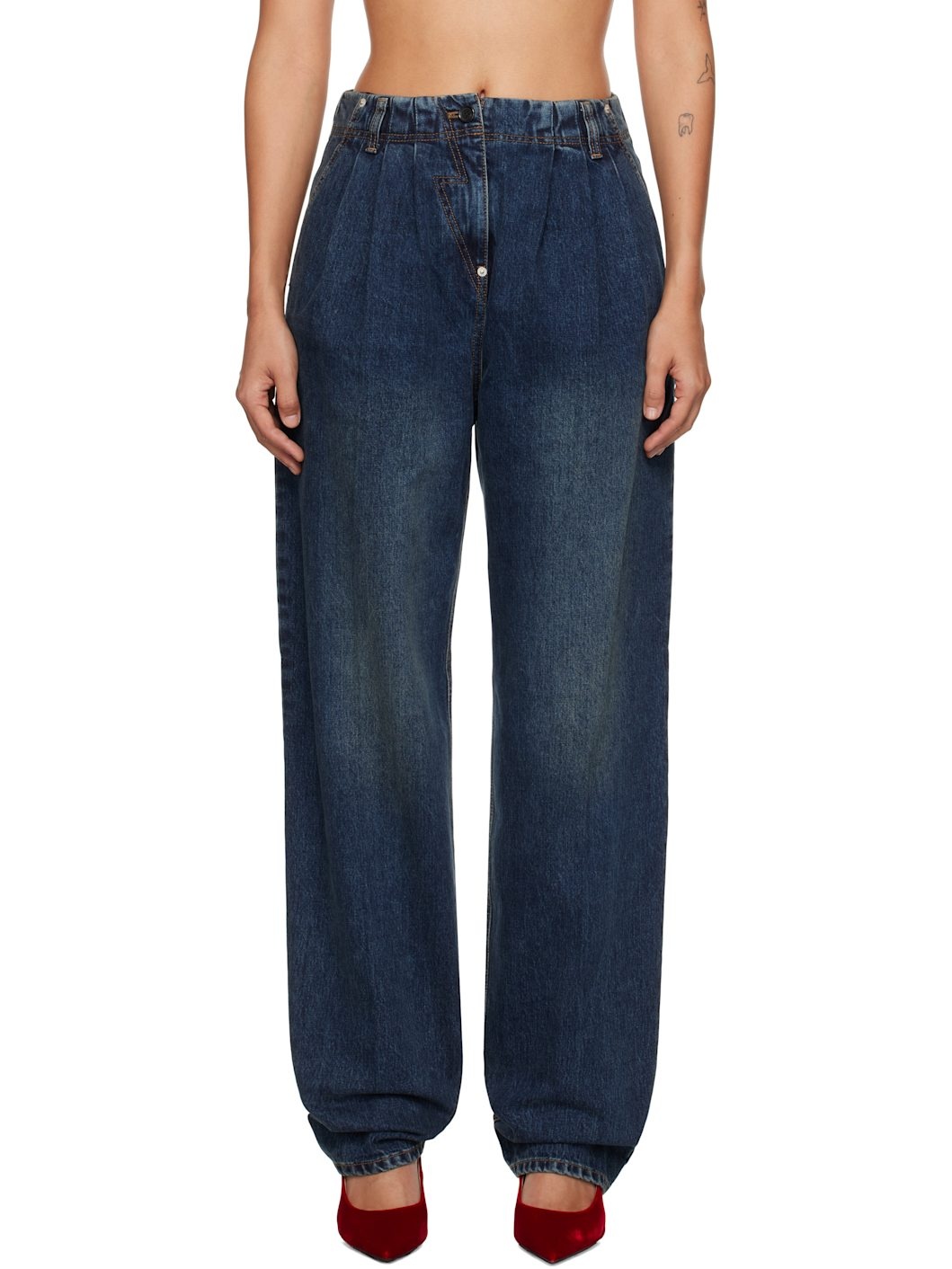 Relaxed-fit tapered non-stretch denim jeans. Fading throughout. · Belt loops · Three-pocket styling · Zip-fly · Pleats at front · Creased legs · Logo patch at back waistband · Contrast stitching in tan Supplier color: Dark blue 100% cotton. Made in South Korea 242252F069018