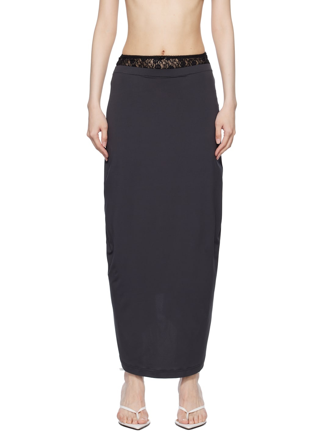 Stretch polyester interlock jersey maxi skirt. Stretch nylon lace briefs-style underlay with bow at elasticized waistband. · Twisted side seams · Draping at curved back hem Supplier color: Dark navy Body 1: 92% polyester, 8% polyurethane. Body 2: 95% nylon, 5% spandex. Made in South Korea 251252F093000