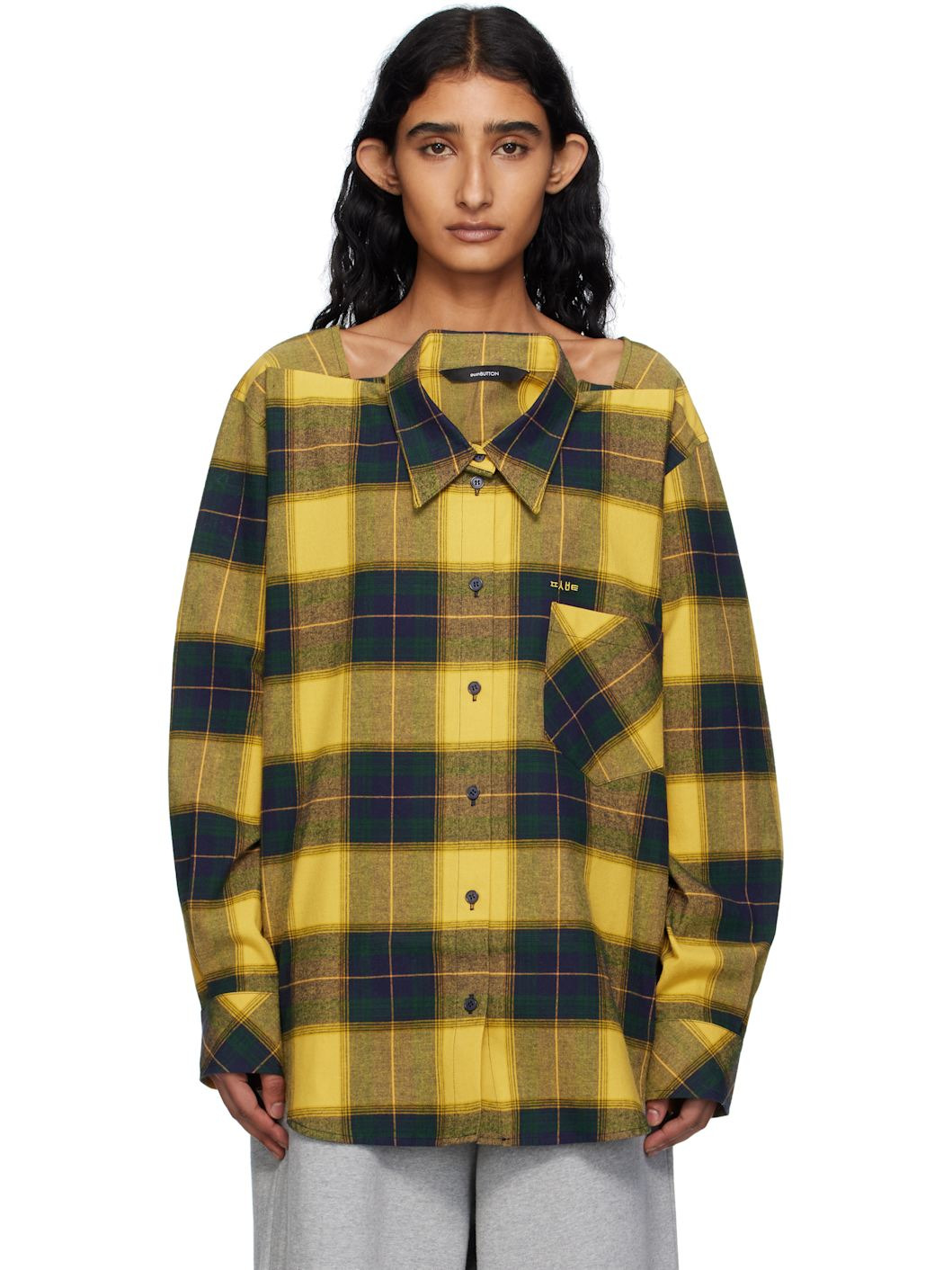 Cotton flannel shirt. · Check pattern throughout · Square neck · Spread collar for alternate styling · Button closure · Embroidered text and patch pocket at chest · Shirttail hem · Dropped shoulders · Buttoned barrel cuffs Supplier color: Gn/Ch 100% cotton. Made in South Korea 252252F109014