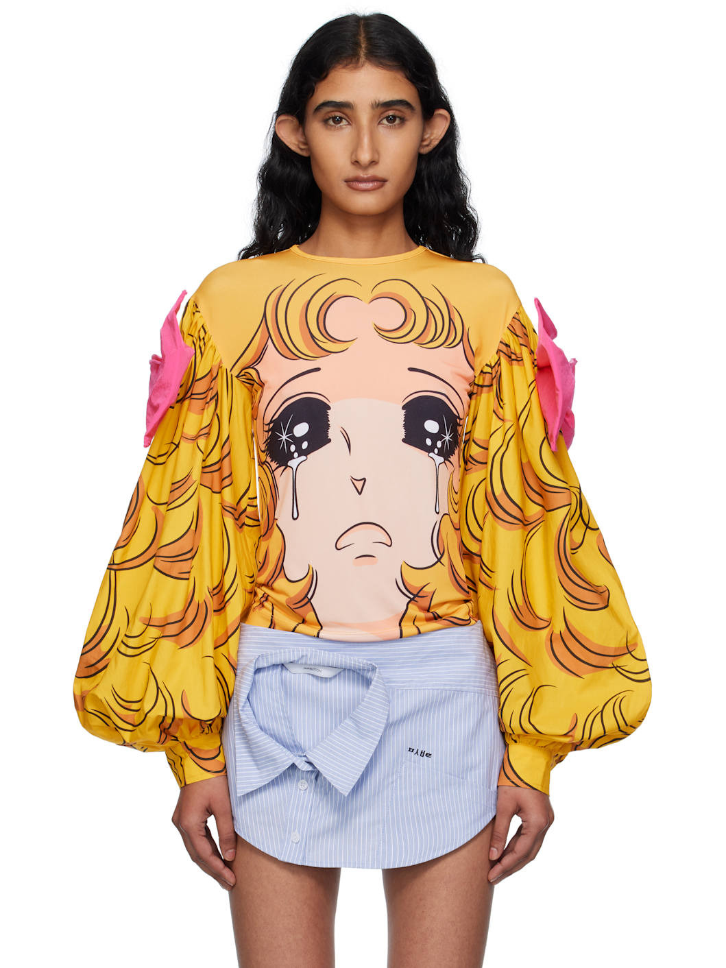 Jersey T-shirt. · Graphic printed throughout · Crewneck · Bow accent at shoulders · Gathering at poplin balloon sleeves · Adjustable buttoned barrel cuffs Supplier color: Yellow Body 1: 100% polyester. Body 2: 100% cotton. Trim: 100% nylon. Made in South Korea 252252F110021