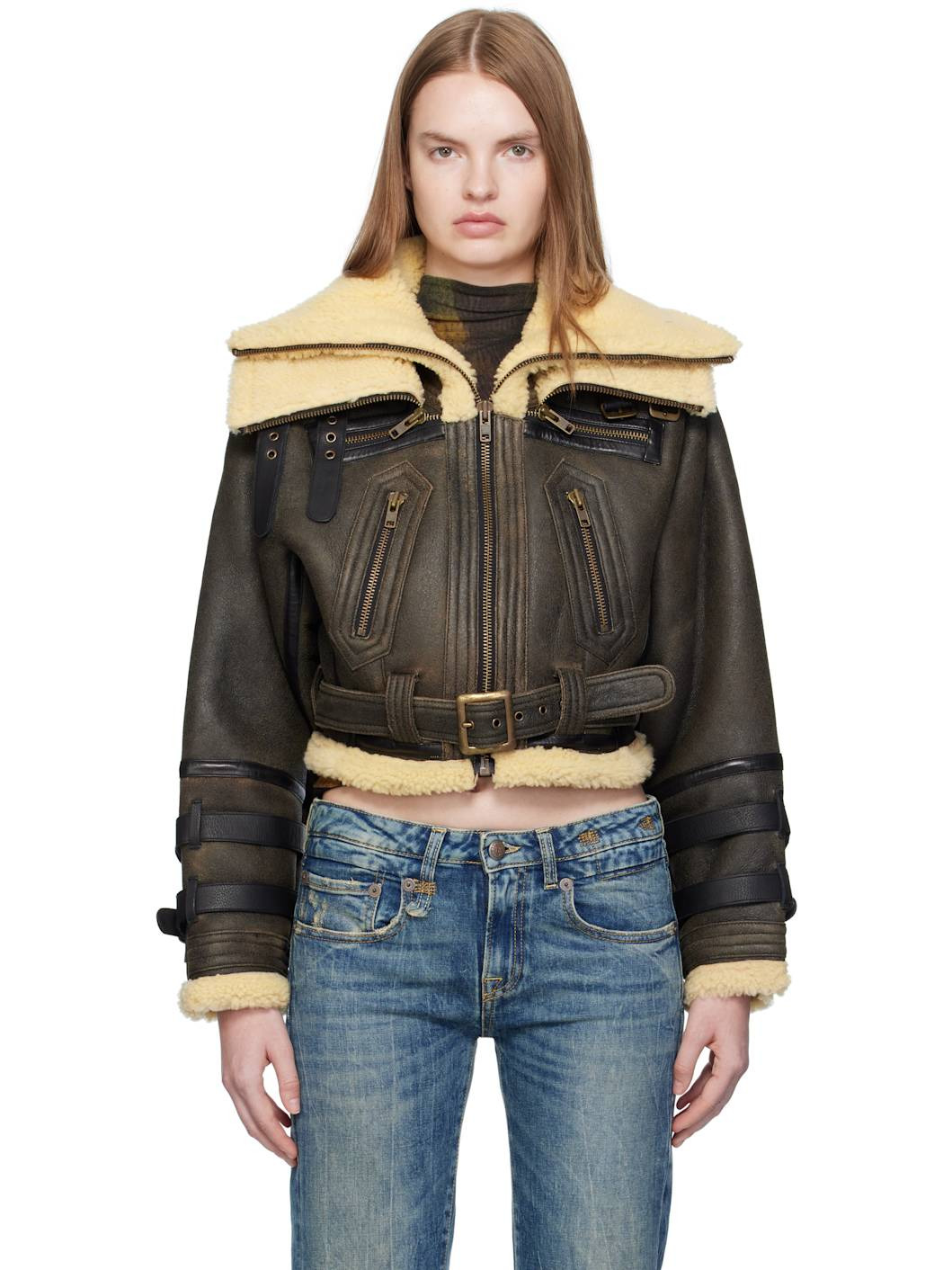 Dyed shearling jacket. · Layered funnel necks · Pin-buckle straps at collar and cuffs · Zip closure · Zip pockets at waist · Cropped hem · Belt loops and detachable pin-buckle belt at hem · Zip vent at cuffs Supplier color: Black with cream 100% dyed shearling lamb fur. Made in India 252021F063004