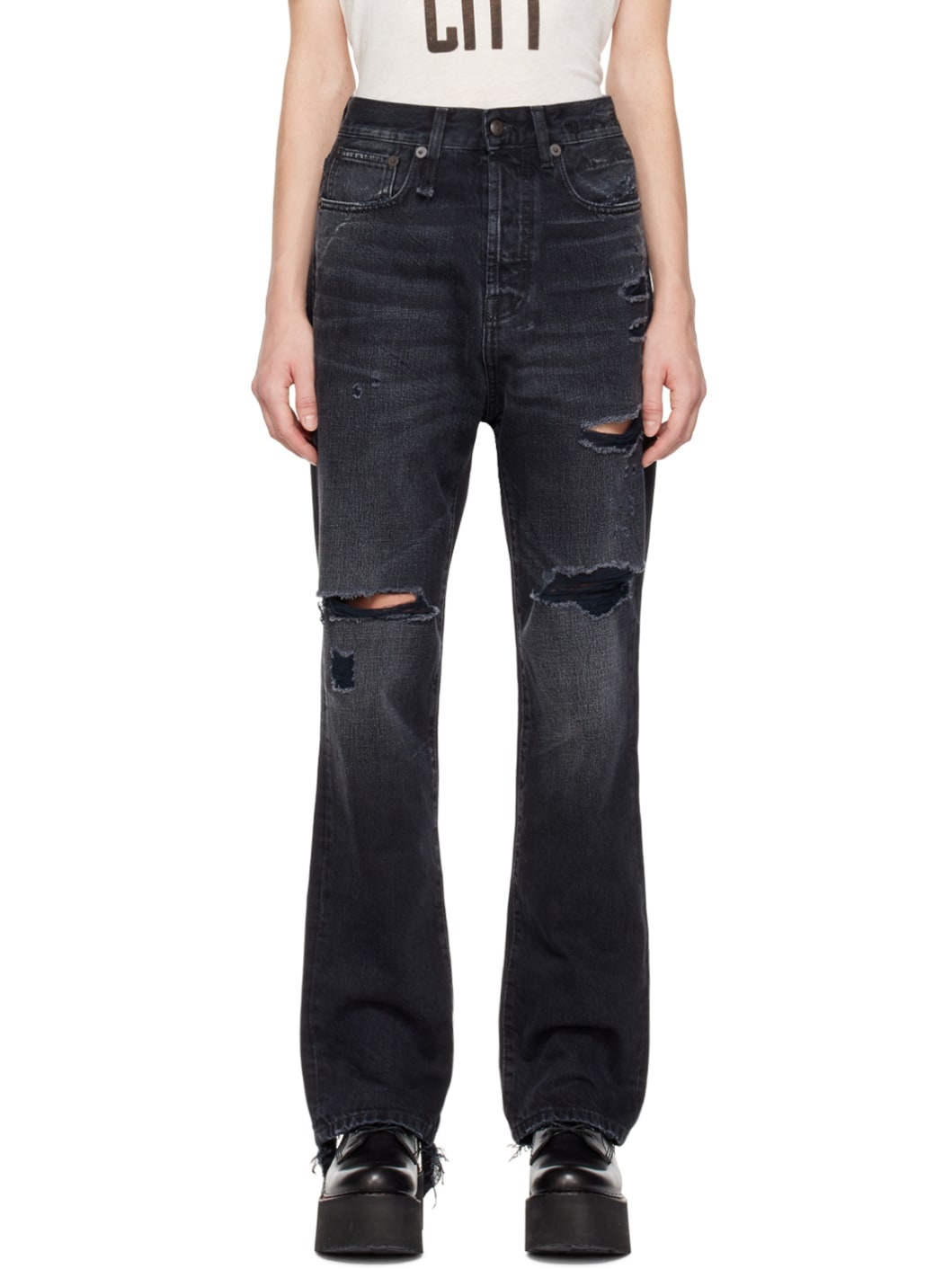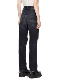13 oz. non-stretch denim jeans. Fading, whiskering, distressing, and loose thread detailing throughout. · Belt loops · Five-pocket styling · Button-fly · Raw edge at cuffs · Textile logo patch at back waistband · Graphic embroidered at back pocket · Logo-engraved antiqued silver-tone hardware Supplier color: Jake black 100% cotton. Made in Italy 222021F069037