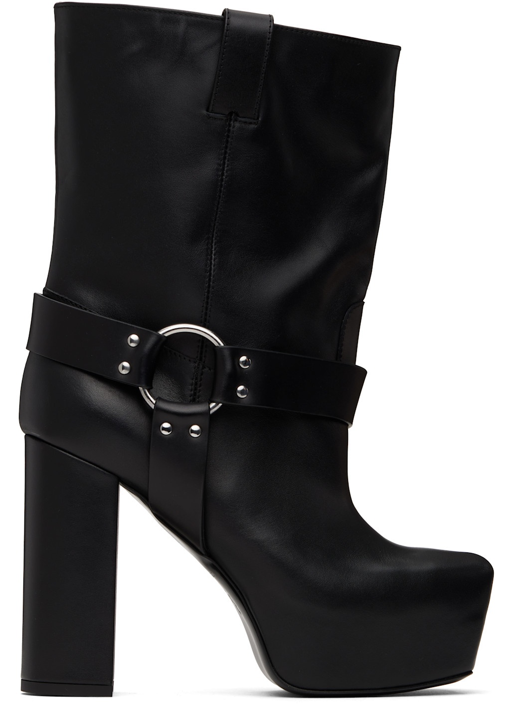 Mid-calf grained leather boots in black. · Square toe · Harness-style strap at vamp · Pull-loops at collar · Buffed leather lining · Covered platform midsole · Covered block heel with rubber injection · Polished leather sole · Platform: H1.25" · Heel: H4.5" Supplier color: Black Upper: leather. Sole: leather, rubber. Made in Italy 251021F114000