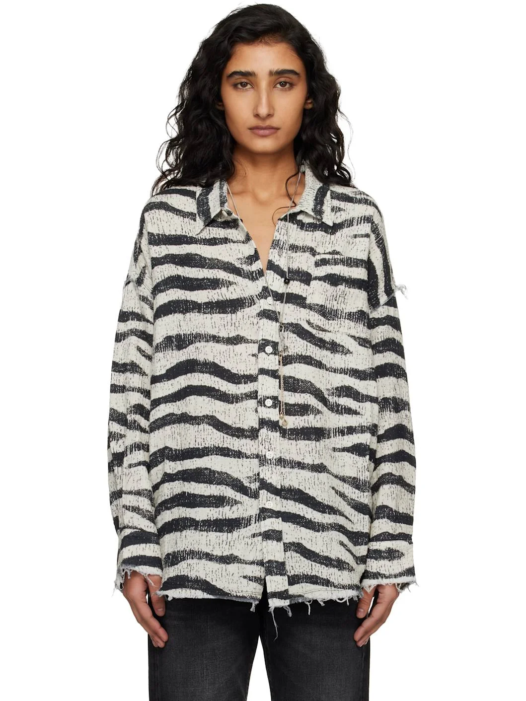 Cotton gauze shirt. · Frayed edges and graphic pattern throughout · Spread collar · Button closure · Patch pocket at chest · Shirttail hem · Dropped shoulders · Buttoned barrel cuffs Supplier color: Black And White Zebra 100% cotton. Made in Italy 261021F109012