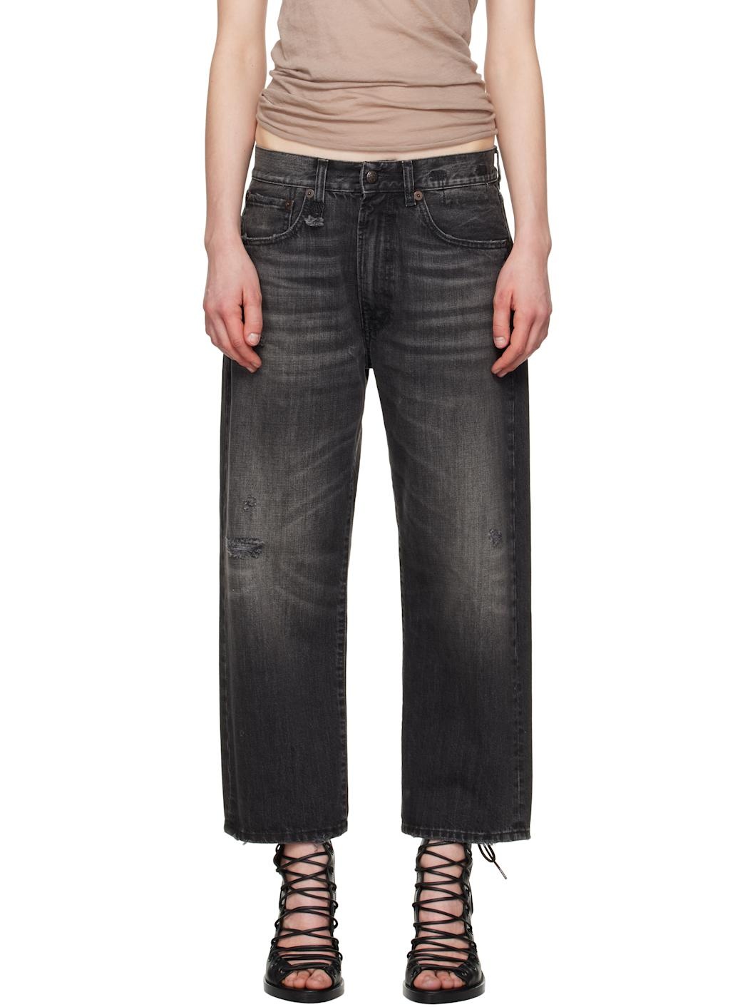 Wide-leg 12.5 oz non-stretch denim jeans. Fading, whiskering, and subtle distressing throughout. · Belt loops · Five-pocket styling · Zip-fly · Rips at legs · Leather logo patch at back waistband · Graphic printed at back pocket · Logo-engraved antiqued copper-tone hardware Supplier color: Wilson black Body: 100% cotton. Trim: 100% leather. Lining: 65% polyester, 35% cotton. Made in Italy 251021F069000