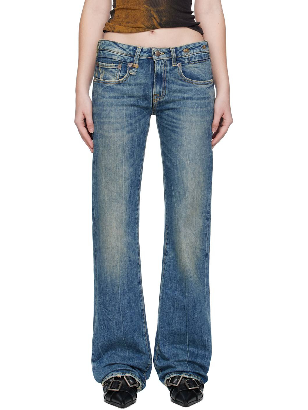Stretch denim jeans. · Fading, whiskering, and distressing throughout · Flared · Belt loops · Five-pocket styling · Zip fly · Leather logo patch at back waistband · Logo-engraved antiqued copper-tone hardware · Contrast stitching in yellow Supplier color: Kelly stretch Body: 98% cotton, 2% elastane. Trim: 100% leather. Pocket lining: 65% polyester, 35% cotton. Made in Italy 252021F069015