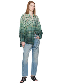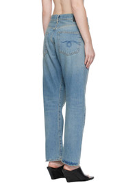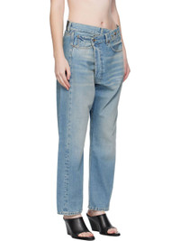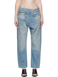 Non-stretch denim jeans. · Fading, whiskering, and distressing throughout · Straight-leg · Belt loops · Adjustable button fastening at asymmetrical waistband · Five-pocket styling · Button fly · Leather logo patch at back waistband · Logo-engraved antiqued copper-tone hardware · Contrast stitching in yellow Supplier color: Merrin blue Body: 100% cotton. Trim: 100% leather. Pocket lining: 65% polyester, 35% cotton. Made in Italy 252021F069004