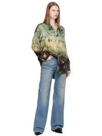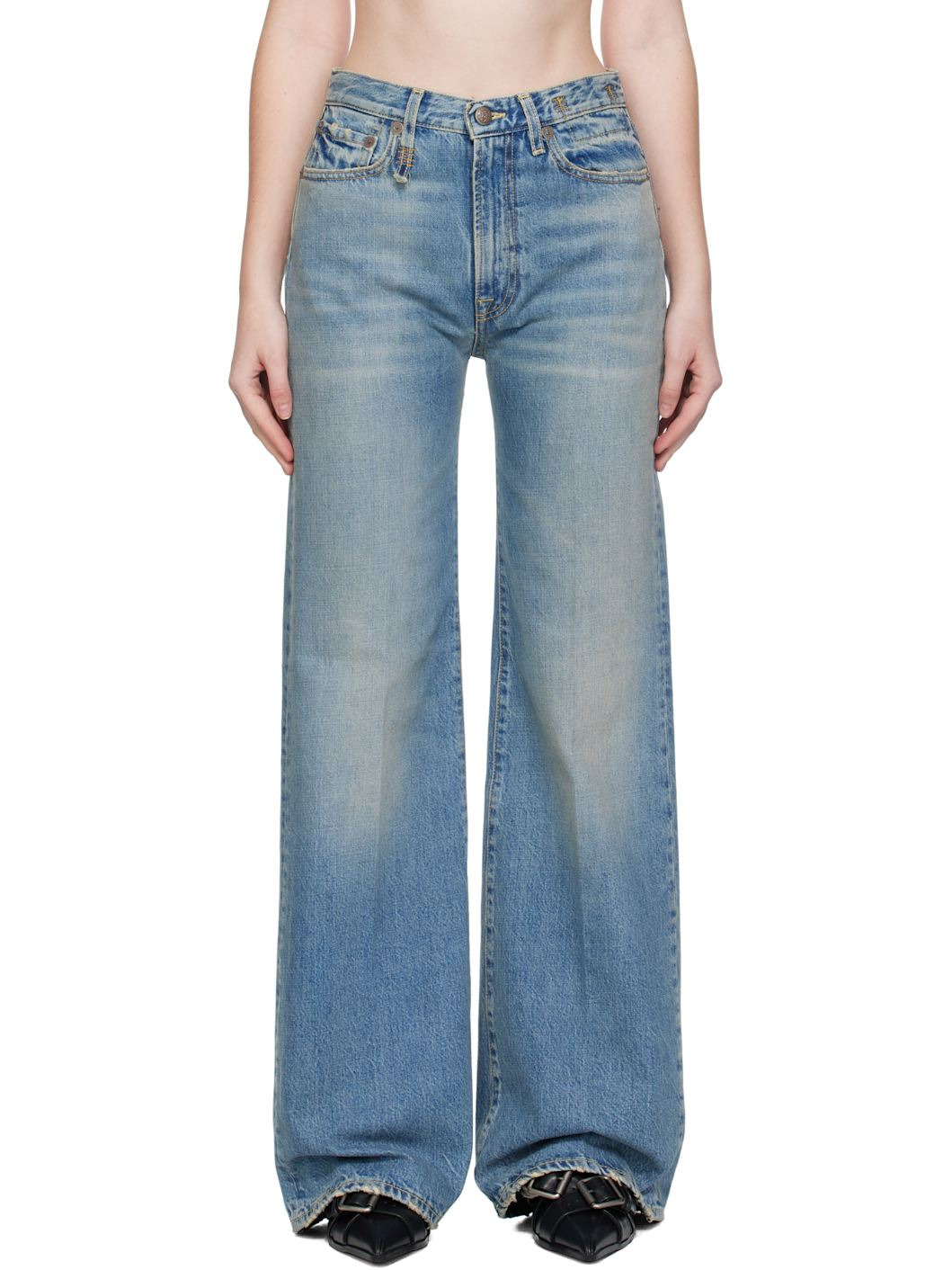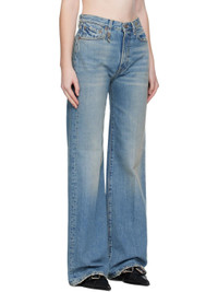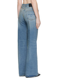 Non-stretch denim jeans. · Fading, whiskering, and distressing throughout · Flared · Belt loops · Five-pocket styling · Zip fly · Creased legs · Leather logo patch at back waistband · Logo-engraved antiqued copper-tone hardware · Contrast stitching in yellow Supplier color: Merrin blue Body: 100% cotton. Trim: 100% leather. Pocket lining: 65% polyester, 35% cotton. Made in Italy 252021F069024