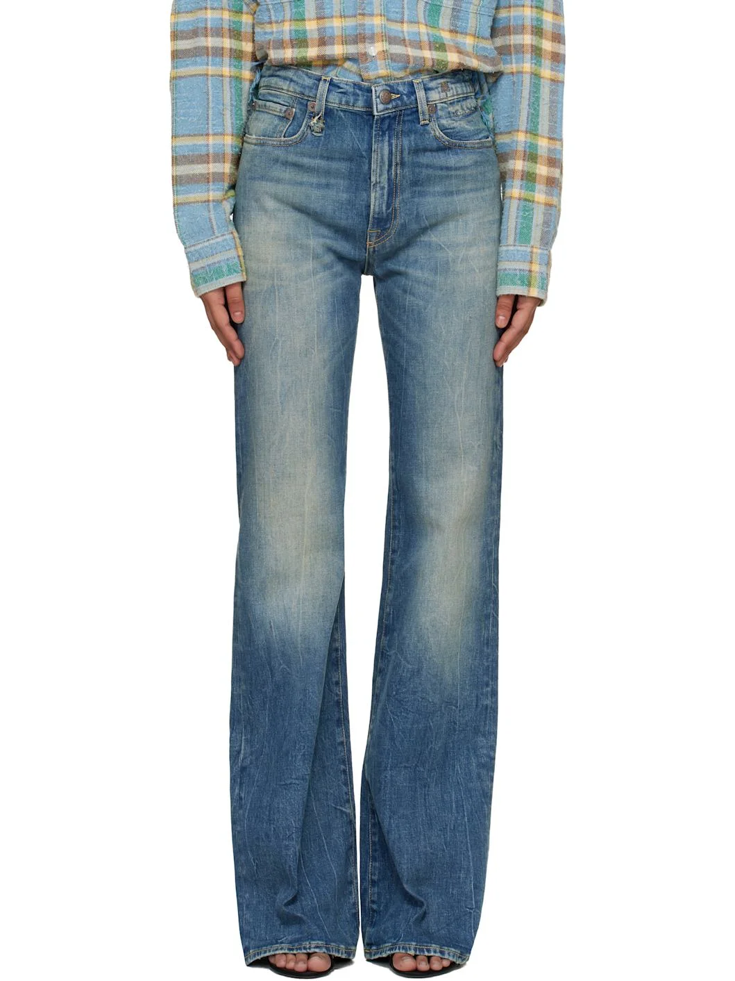 Stretch denim jeans. · Fading, whiskering, and creasing throughout · Flared · Belt loops · Extended raw-edge belt loop at front · Five-pocket styling · Zip fly · Leather logo patch at back waistband · Dyed detailing at back pocket · Contrast stitching in yellow · Oxidized hardware Supplier color: Kelly Stretch 98% cotton, 2% elastane. Made in Italy 261021F069027