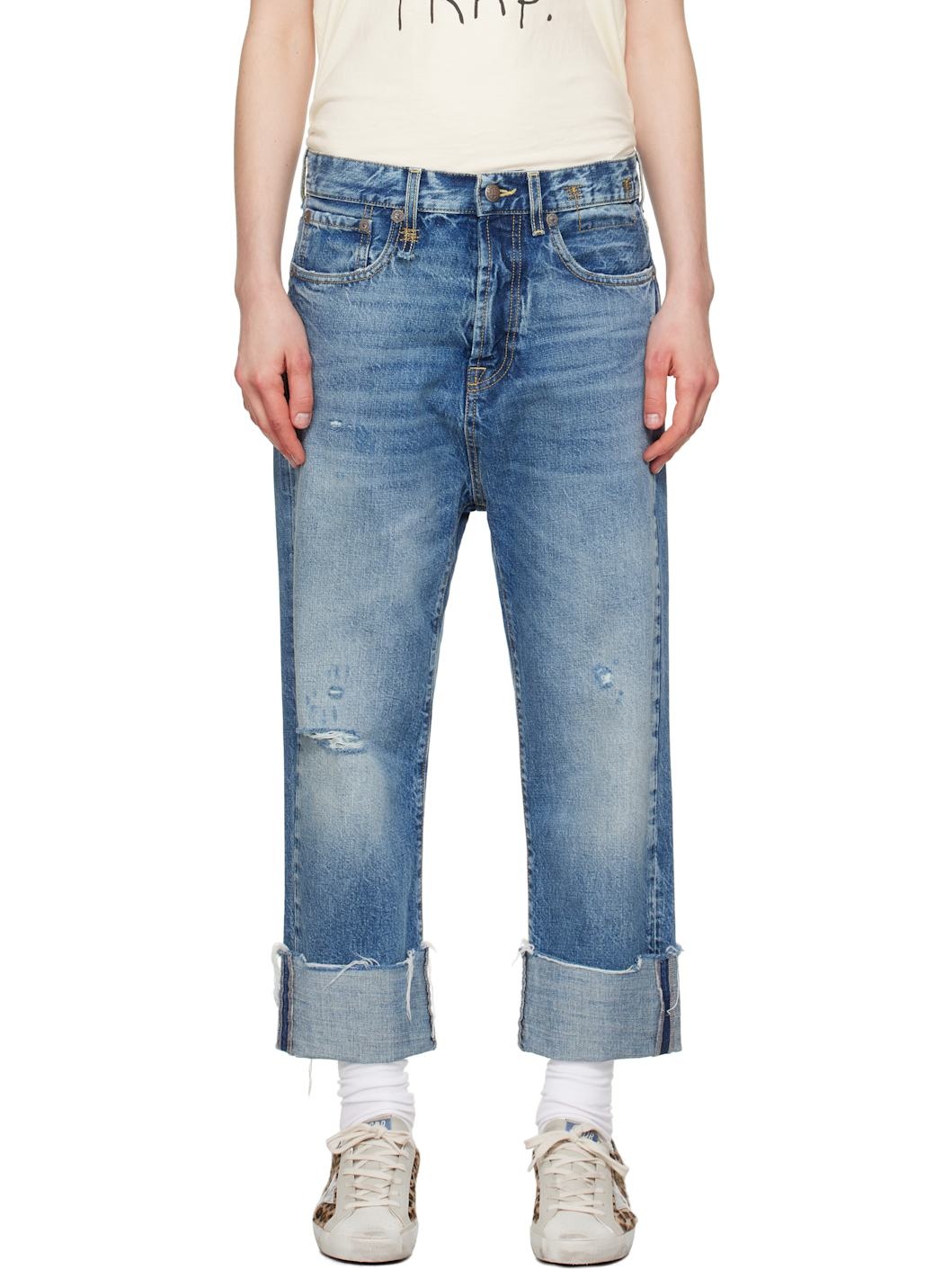 Non-stretch denim jeans. Fading, whiskering, and distressing throughout. · Belt loops · Five-pocket styling · Button-fly · Dropped inseam · Raw edge at cuffs · Leather logo patch at back waistband · Graphic printed at back pocket · Logo-engraved copper-tone hardware · Contrast stitching in yellow Supplier color: Hutton blue Body: 100% cotton. Trim: 100% leather. Lining: 65% polyester, 35% cotton. Made in Italy 251021F069011