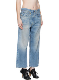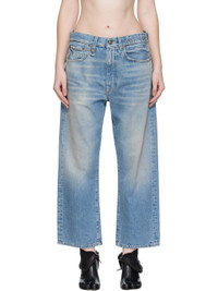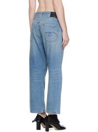 Non-stretch denim jeans. · Fading, whiskering, and distressing throughout · Loose-fit · Belt loops · Five-pocket styling · Zip fly · Leather logo patch at back waistband · Logo-engraved antiqued copper-tone hardware · Contrast stitching in yellow Supplier color: Merrin blue Body: 100% cotton. Trim: 100% leather. Pocket lining: 65% polyester, 35% cotton. Made in Italy 252021F069009