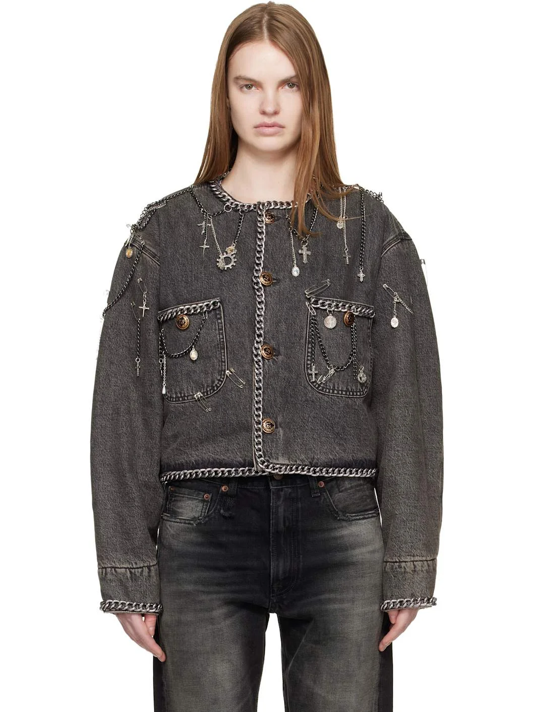 Non-stretch denim jacket. · Curb chains and graphic charms throughout · Raw edge at round collar · Button closure · Patch pockets at front · Cropped hem · Buttoned barrel cuffs · Full quilted twill lining Supplier color: Dusky grey Body: 100% cotton. Lining: 100% polyester. Made in Italy 252021F060005