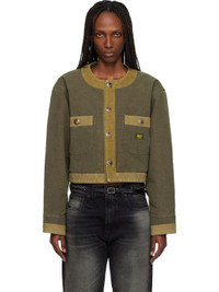 Cotton canvas chore jacket. · Corduroy trim throughout · Round neck · Button closure · Patch pockets at chest · Logo patch at front · Cropped hem · Dropped shoulders · Buttoned barrel cuffs · Patch pocket at interior · Full quilted sateen lining · Logo-engraved gold-tone hardware Supplier color: Dusky olive canvas green Body: 100% cotton. Lining: 100% polyester. Made in Italy 252021F063007
