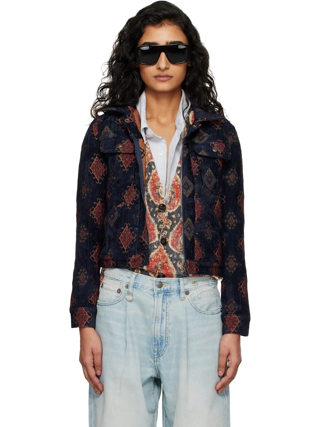 Cotton-blend gobelin jacket. · Jacquard graphic pattern throughout · Spread collar · Zip closure · Flap pockets at chest · Welt pockets at waist · Barrel cuffs · Logo-engraved brass-tone hardware Supplier color: Navy Blue Jacquard Body: 55% acrylic, 33% polyester, 10% cotton, 2% other fibres. Trim: 100% leather. Made in Italy 261021F063001