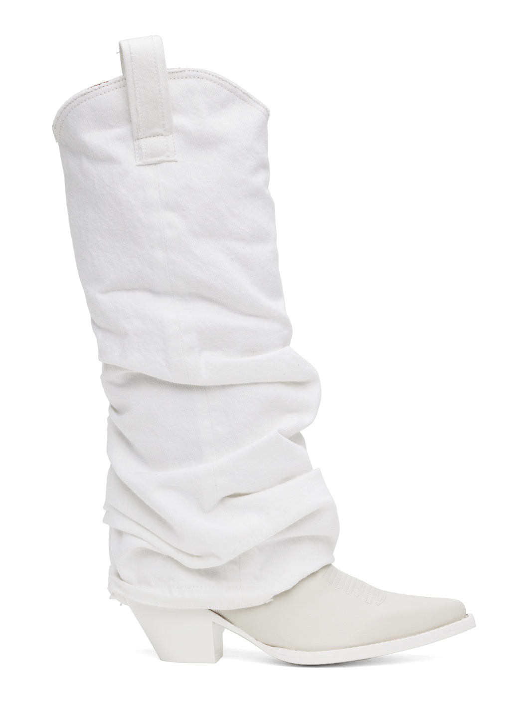 Knee-high non-stretch denim and buffed leather boots in white. · Gathering and subtle distressing throughout · Layered construction · Pointed toe · Embroidered detailing at vamp · Pull-loops at collar · Concealed elasticized gusset at sides · Buffed leather lining · Topstitching at welt · Stacked leather block heel with rubber injection · Leather sole · Heel: H2.25" Supplier color: White denim Upper: textile, leather. Sole: leather, rubber. Made in Italy 242021F114007