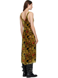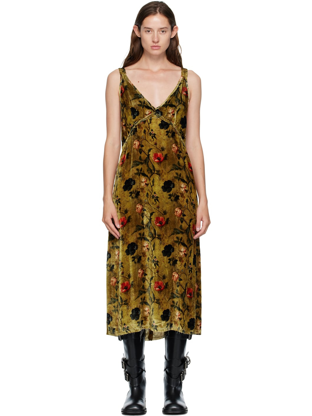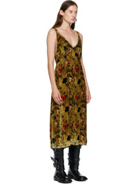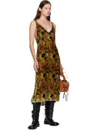 Viscose- and silk-blend velvet midi dress. · Floral pattern printed throughout · V-neck · Raw edge at hem · Zip closure at back · Partial mesh lining Supplier color: Ochre floral 82% viscose, 18% silk. Made in United States 252021F054003