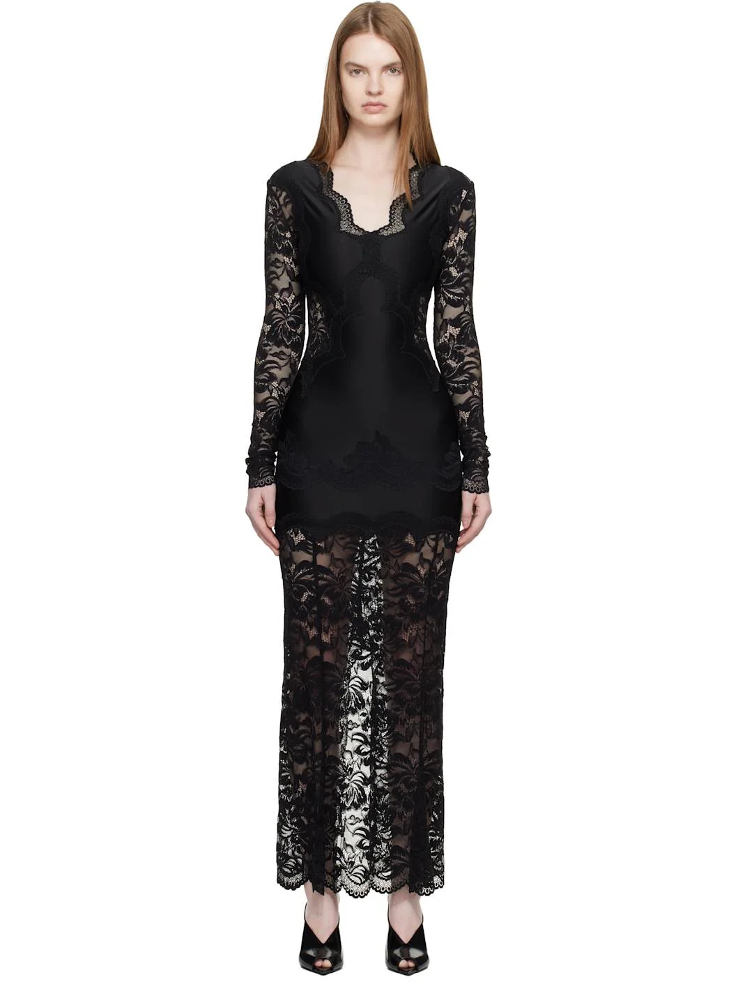 Stretch jersey and sheer lace maxi dress. · Embroidered pattern throughout · Scalloped edge at V-neck, hem, and cuffs · Zip closure at back · Vent at back hem · Unlined Supplier color: Black 64% polyamide, 25% viscose, 10% elastane, 1% polyester. Made in Bulgaria 261605F055001