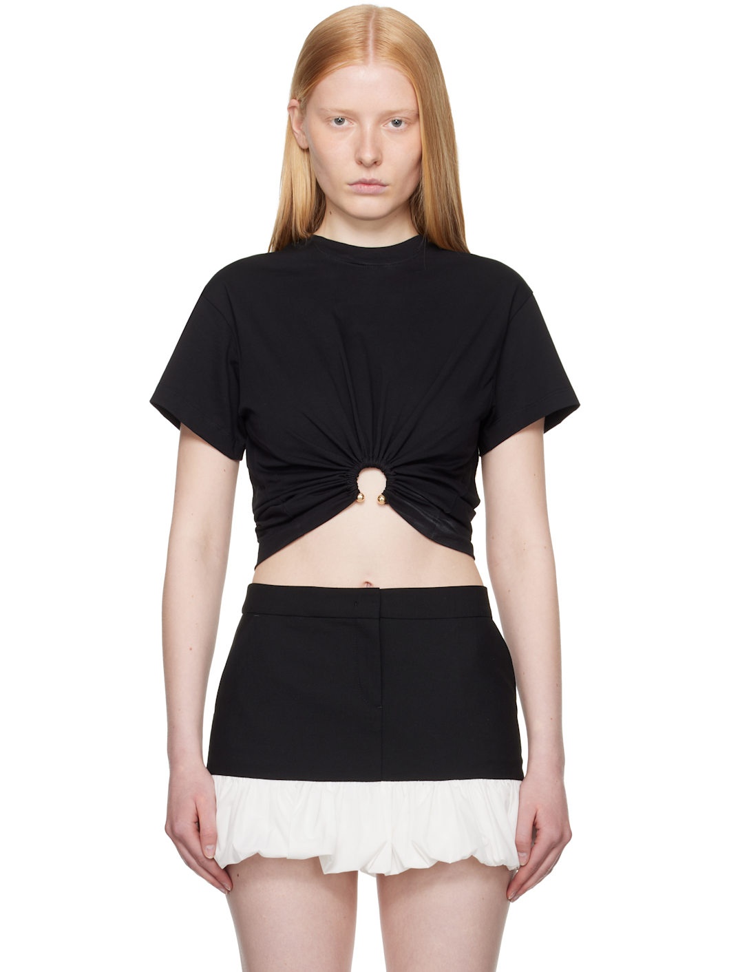Cotton jersey T-shirt. · Rib-knit crewneck · Gathering and covered hardware at cropped hem · Logo hardware at back collar Supplier color: Black 100% cotton. Made in Portugal 252605F110001