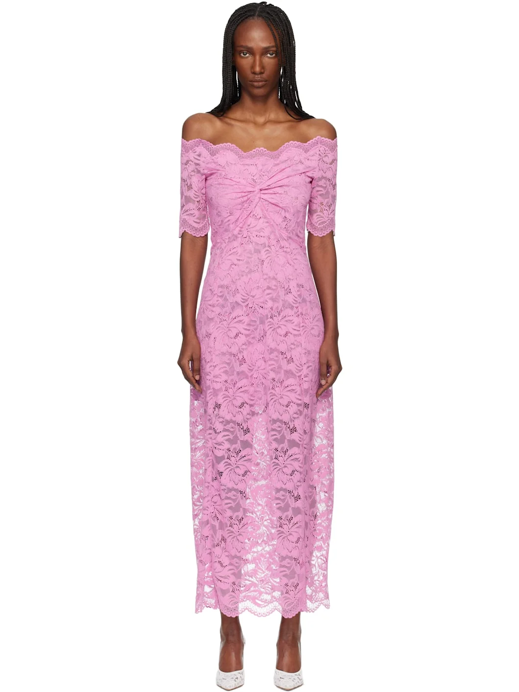 Semi-sheer stretch nylon lace maxi dress. · Scalloped edges and sequins throughout · Off-the-shoulder construction · Partially lined Supplier color: Camelia pink 90% polyamide, 10% elastane. Made in Portugal 261605F055000